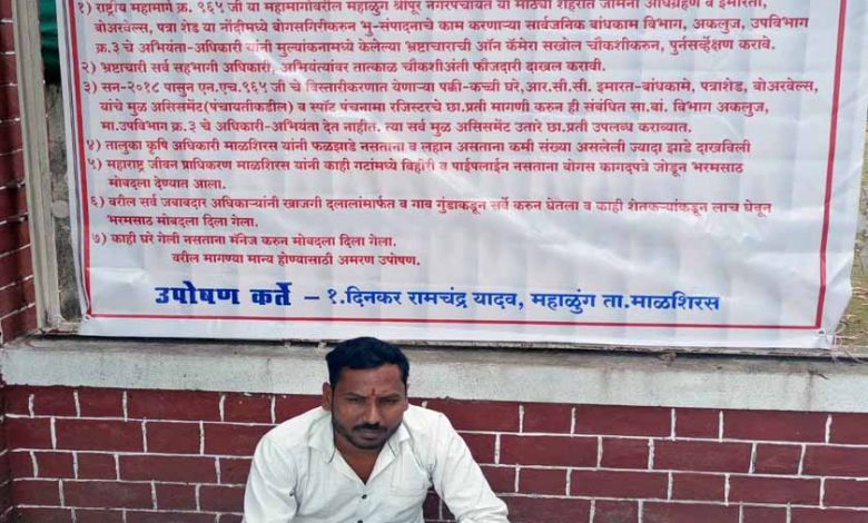 महाळुंग तालुका माळशिरस हद्दी मधून संत तुकाराम महाराज पालखी महामार्ग NH 965 G गेलेला आहे. भूसंपादन करताना व शेतकऱ्यांना लाभ देताना मोठ्या प्रमाणात दलालांमार्फत, वरिष्ठ अधिकाऱ्यांना व यातील संबंधित इतरांना मोठ्या प्रमाणात आर्थिक देवाण-घेवाण झाली आहे. संत तुकाराम महाराज पालखी महामार्ग एन. एच. ९६५ जी महाळुंग हद्दीमधील बोगस व बनावट कागदपत्रे करून पैसे मिळविले आहेत. संबधीत अधिकारी व लाभधारकांवरती कडक कारवाई करून शासनाचा पैसा वसुल करणे बाबत तसेच माहितीच्या अधिकारामध्ये माहिती मागवली असता एक ऑफिस दुसऱ्या ऑफिसवर, दुसरे ऑफिस, तिसऱ्या ऑफिसवर टोलवा टोलवी करून लेखी उत्तरे देत आहेत. मागवलेली माहिती देत नाहीत. मग माहिती देण्यासाठी टाळाटाळ कशासाठी? अशा अनेक बेकायदा केलेल्या कृत्यासाठी दोन महिन्यापूर्वी बांधकाम विभाग सोलापूर ऑफिसच्या समोर याच कार्यकर्त्याने उपोषण केले होते. चौकशी करून कारवाई करतो असे लेखी आश्वासन दिले होते. परंतु काहीही केले नाही. न्याय मिळवण्यासाठी व शासनाचा पैसा जो कोट्यावधी रुपयांचा भ्रष्टाचार होऊन काही दलाल व शासकीय अधिकाऱ्यांच्या खिशामध्ये गेलेला आहे. तो शासनाला परत करावा संबंधित अधिकारी, बोगस लाभधारक, बोगस कागदपत्रे बनवून, ज्यादा मूल्यांक दाखवले आहे. अशा संबंधित इतर अधिकारी यांच्यावरती कडक कारवाई करावी. यासाठी दिनकर यादव यांनी पुणे येथील विभागीय आयुक्त कार्यालयासमोर 14 ऑगस्ट 2023 रोजी पासून अमरन उपोषण सुरू केले आहे.