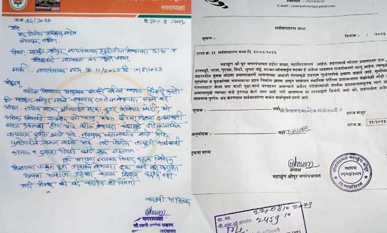 श्रीपूर तालुका माळशिरस येथील नवनिर्मित नगरपंचायतीच्या नगराध्यक्षा लक्ष्मी अशोक चव्हाण, नगरसेविका तेजश्री विक्रमसिंह लाटे, नगरसेविका ज्योत्स्ना रावसाहेब सावंत-पाटील व इतर सहकाऱ्यांनी सोलापूर ग्रामीण पोलीस अधीक्षक यांना अवैध धंदे बंद करण्यासाठी निवेदन दिले आहे. सर्वसाधारण सभेत याबाबतचा ठराव क्रमांक 11/2023 मंजूर करण्यात आला आहे. गावामध्ये व महाळुंग-श्रीपूर हद्दीमध्ये बेकायदा विक्री केली जाणारी दारू, केमिकल मिश्रित ताडी(शिंदी), जुगार, मटका, गुटखा, गांजा, ऑनलाइन लॉटरी, ऑनलाईन मटका असे अनेक अवैद्य धंदे नगरपंचायत हद्दीमध्ये गेले अनेक वर्षापासून. सुरू आहेत. लहान मोठ्या हॉटेल ढाब्यामध्ये सुद्धा बेकायदा दारू विक्री सुरू आहे, पाठीमागच्या बाजूला मटका सुरू आहे. हे सर्वत्र चित्र पाहावयास मिळत आहे.