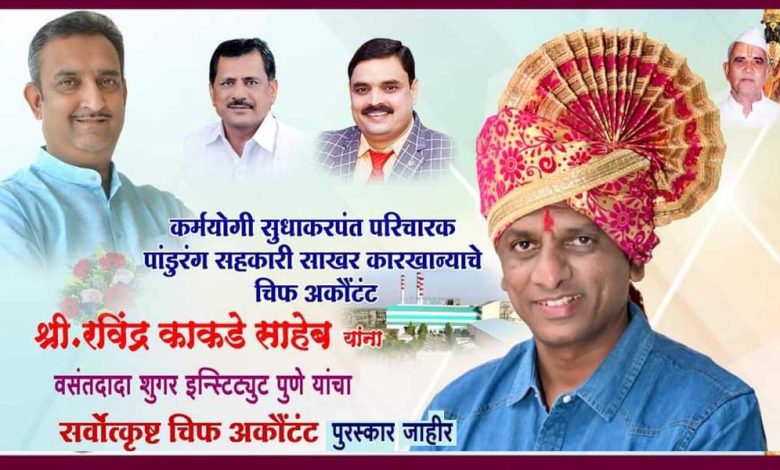 श्रीपूर तालुका माळशिरस येथील कर्मयोगी सुधाकरपंत परिचारक पांडुरंग सहकारी साखर कारखान्याचे चीफ अकॏटंट रवींद्र काकडे यांना वसंतदादा शुगर इन्स्टिट्यूट पुणे यांच्या वतीने सन २०२३-२४ सालामध्ये देण्यात येणारा पुरस्कार जाहीर झाला आहे.