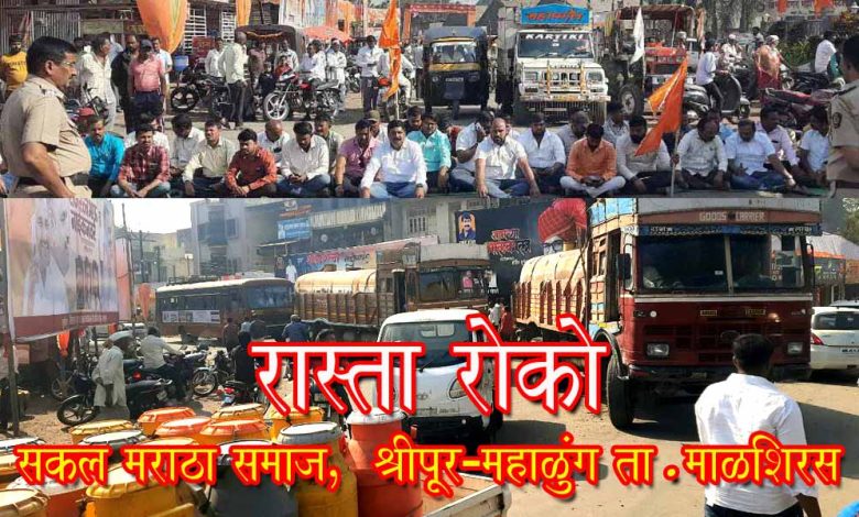 श्रीपूर तालुका माळशिरस येथील सखल मराठा समाज बांधव महाळुंग-श्रीपूर आणि माळशिरस तालुक्यातील मराठा बांधवांकडून मनोज जरांगे पाटील यांच्या आंदोलनाला पाठिंबा देण्यासाठी, ओबीसी मधूनच 50% च्या आत सुप्रीम कोर्टात टिकणारे आरक्षण देण्यासंदर्भात, सगेसोयरे याच्या व्याख्या शासनाने स्पष्ट कराव्यात अशा मागण्यांसाठी श्रीपूर मध्ये रस्ता रोको करण्यात आला.