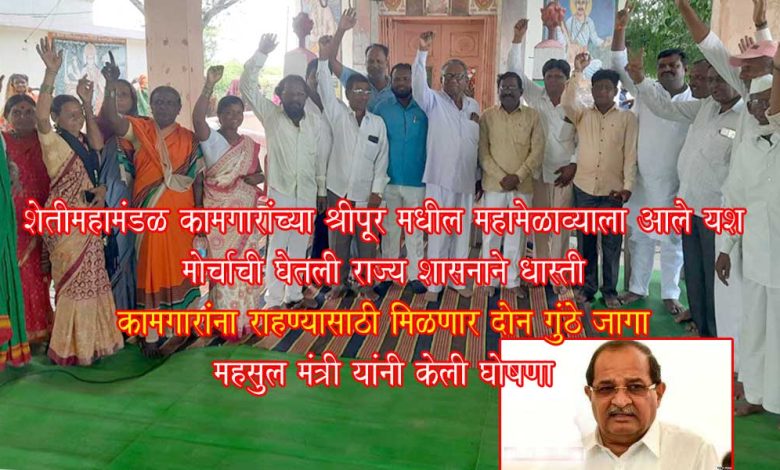 राज्यातील शेती महामंडळाच्या चौदा ऊस मळ्यातील कामगारांना रहाण्यासाठी राज्यशासनाने दोन गुंठे राहण्यासाठी जागा देण्याचे आज पुण्यामध्ये झालेल्या बैठकीत महसूल मंत्री राधाकृष्ण विखे पाटील यांनी जाहीर केले. इतर उर्वरीत मागण्या मंत्रीमंडळ उच्चस्तरीय बैठकीत पुढे निर्णय घेण्यात येईल असे मंत्रीमहोदय यांनी सांगितले. गेले अनेक वर्षे शेती महामंडळ कामगार रहाण्याच्या जागेचा प्रश्न प्रलंबित होता. शेती महामंडळ कामगार संघटना यांनी जोर लावून हा प्रश्न सोडवला आहे. गेल्या काही श्रीपूर येथे शेती महामंडळाच्या कामगारांचा मेळावा घेण्यात आला होता. त्या मेळाव्यात कामगारांच्या प्रश्नावर पुणे येथील विभागीय कार्यालयावर मोर्चा काढण्याचे ठरले होते. कामगार संघटना लढा कृती समितीचे लढाऊ नेते सुभाषराव कुलकर्णी माळशिरस तालुका राष्ट्रीय साखर कामगार संघ माळशिरस तालुका शेती महामंडळ युनिट सेक्रेटरी भालचंद्र शिंदे पाटील यांनी हा प्रश्न सोडवण्यासाठी प्रयत्न करून दोन गुंठे जागा मिळवून दिली त्या बद्दल शेती महामंडळ कामगारांनी आनंद व्यक्त केला आहे. महामंडळ कार्यक्षेत्रातील कामगारांनी फटाके फोडून आनंद साजरा केला. याबद्दल कामगार संघटनाच्या सदस्यांनी राज्य शासनाचे आभार मानले. आणि राहिलेल्या मागण्या त्वरित मंजूर करण्याबाबत विनंती देखील केली.