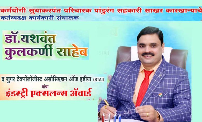 डॉ.यशवंत कुलकर्णी यांना STAI चा इंडस्ट्री एक्सलन्स अवॉर्ड जाहीर | श्रीपूर | पांडुरंग साखर कारखान्याचा सन्मान! |
