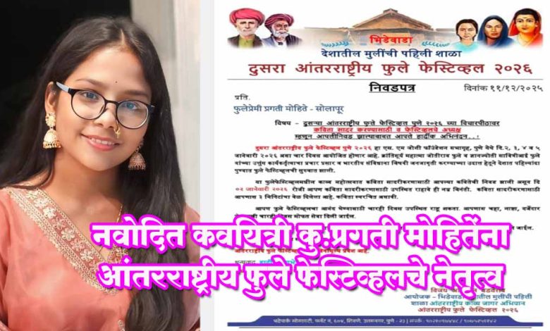महात्मा ज्योतिराव फुले व क्रांतीज्योती सावित्रीबाई फुले यांच्या विचारांचा जागर देश-विदेशात पोहोचवण्याच्या उद्देशाने आयोजित करण्यात येणाऱ्या दुसऱ्या आंतरराष्ट्रीय फुले फेस्टिव्हल २०२६ च्या अध्यक्षपदी सोलापूर जिल्ह्यातील अकलूज येथील नवोदित कवयित्री कु.प्रगती राजू मोहिते यांची निवड करण्यात आली आहे.