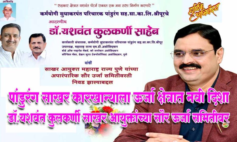 श्रीपूर तालुका माळशिरस येथील कर्मयोगी सुधाकरपंत परिचारक पांडुरंग सहकारी साखर कारखान्याचे कार्यकारी संचालक डॉ. यशवंत कुलकर्णी यांची साखर आयुक्त कार्यालयाच्या अपारंपारिक (सौर) ऊर्जा प्रकल्प राबविण्यासाठी गठीत करण्यात आलेल्या महत्त्वपूर्ण समितीवर निवड झाली आहे. ही निवड सहकार आणि ऊर्जा क्षेत्राच्या दृष्टीने अत्यंत महत्त्वाची मानली जात आहे.